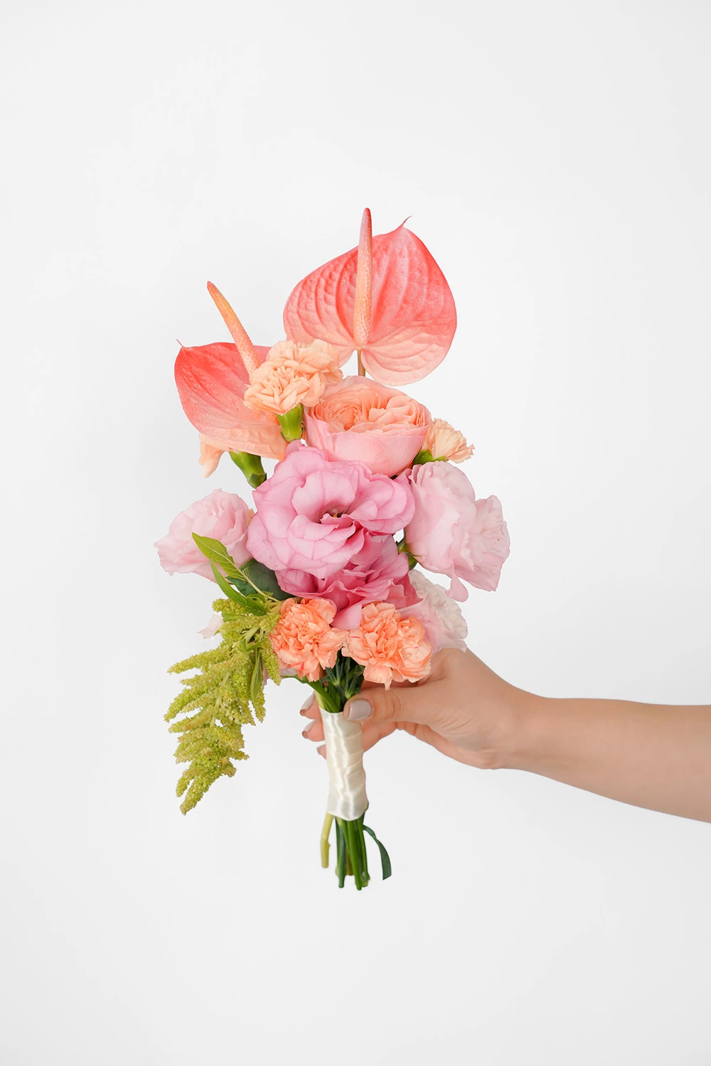 این دسته گل عمودی و شیک، با آنتوریوم هلویی، رزهای صورتی، لیسیانتوس و گل‌های میخک،