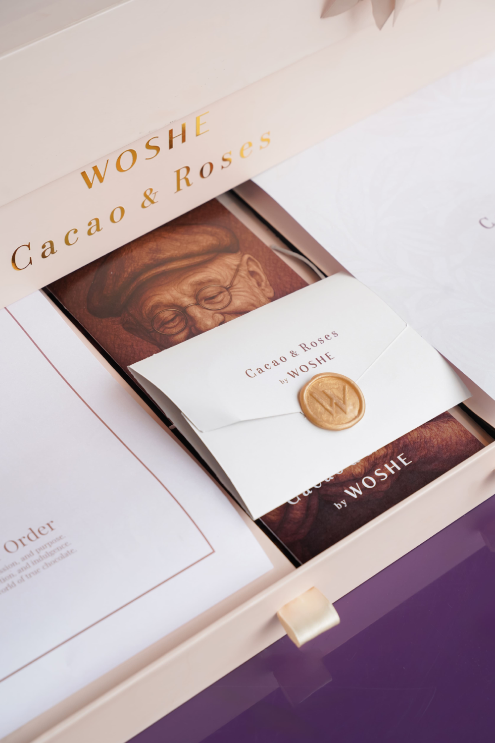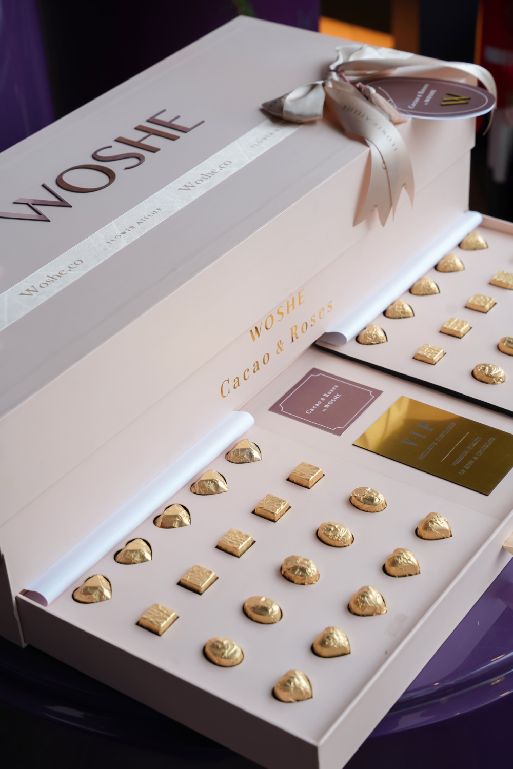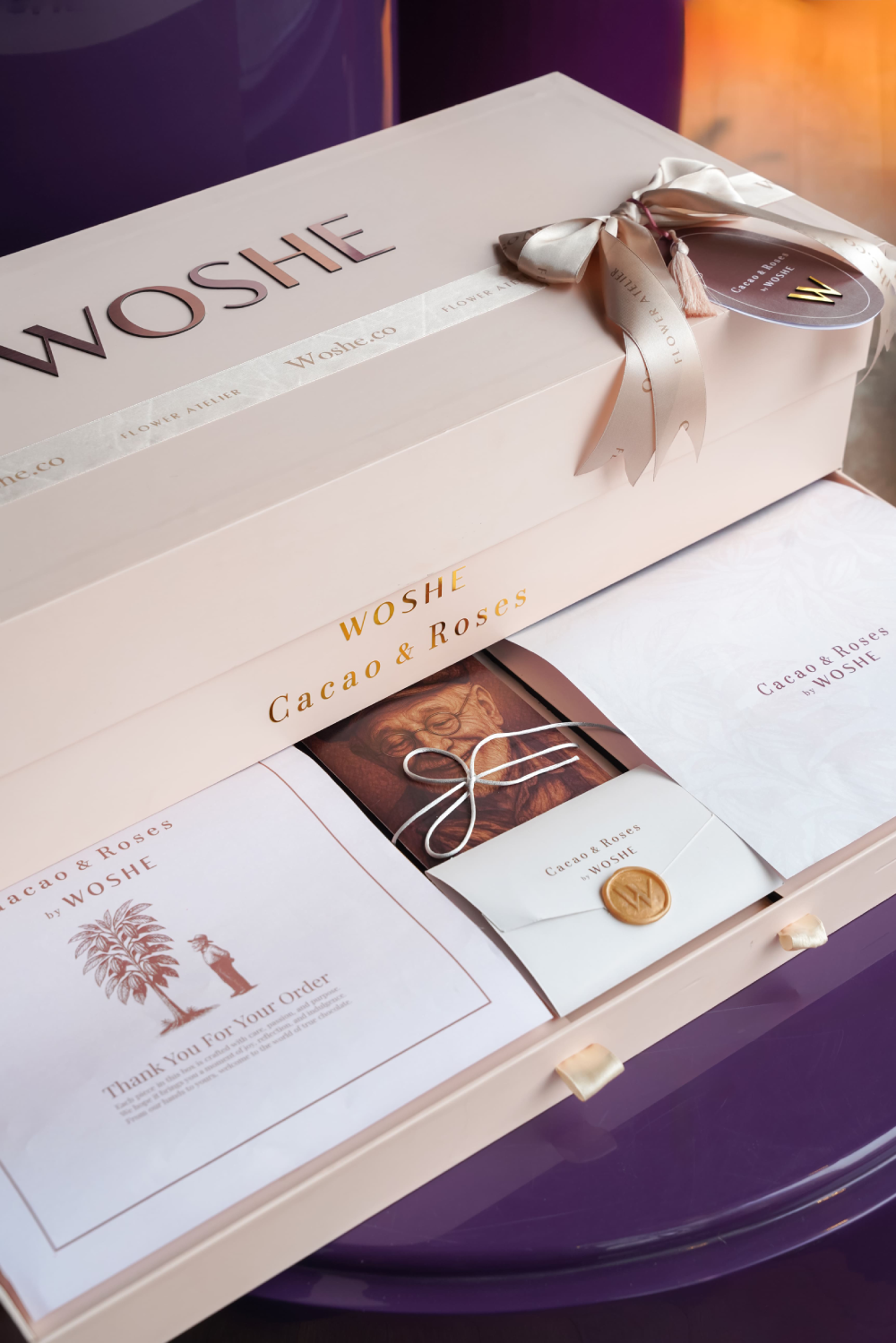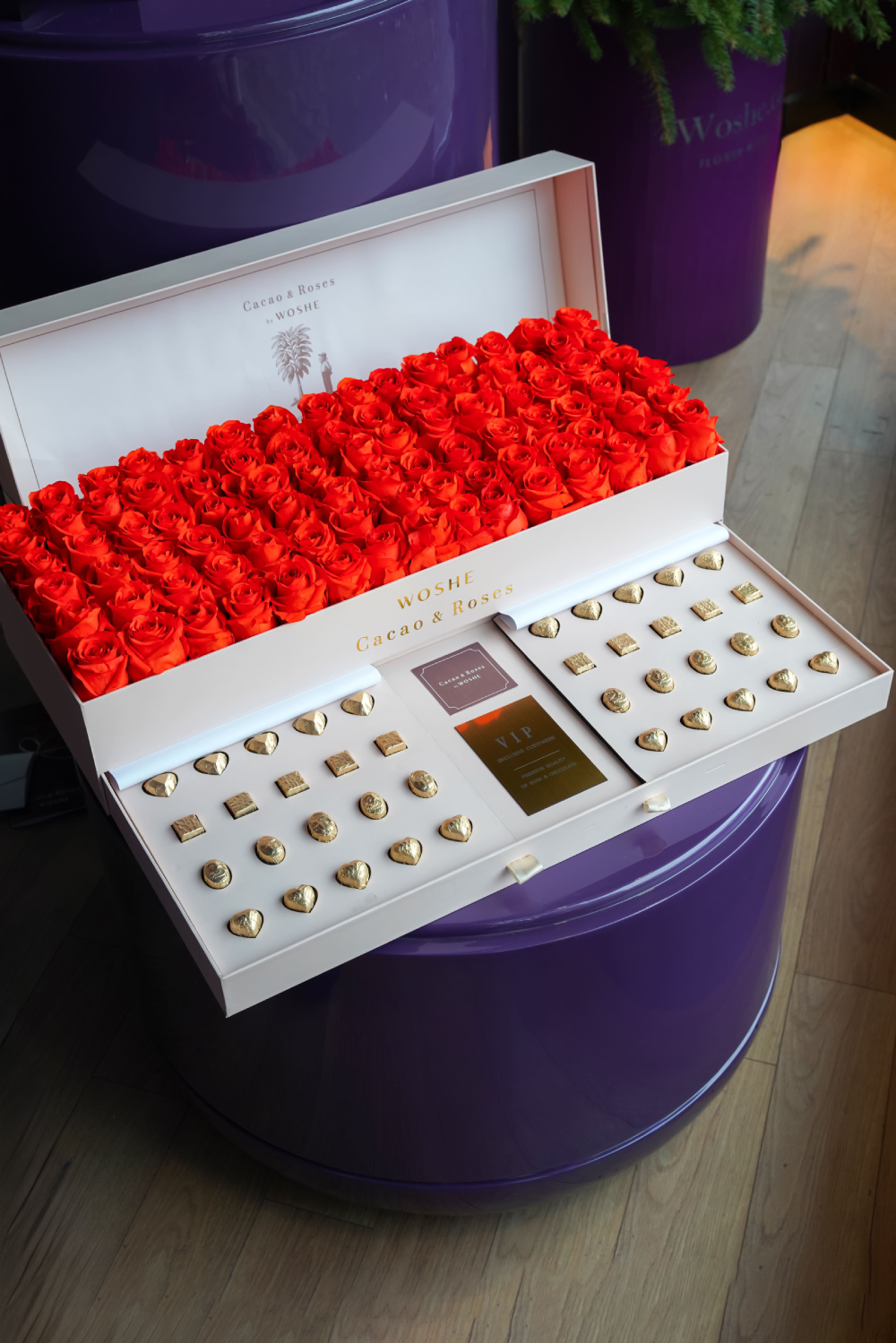 ترکیبی از رزهای جاودان متعدد در کنار شکلات‌های دست‌ساز بلژیکی، در باکسی شفاف و مینیمال که زیبایی را بی‌واسطه نشان می‌دهد؛