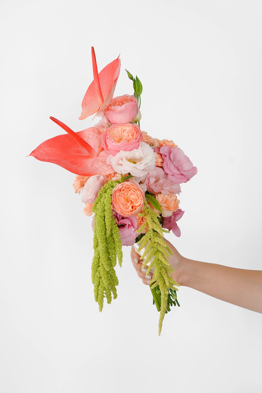 این دسته گل عمودی و شیک، با آنتوریوم هلویی، رزهای صورتی، لیسیانتوس و گل‌های میخک،