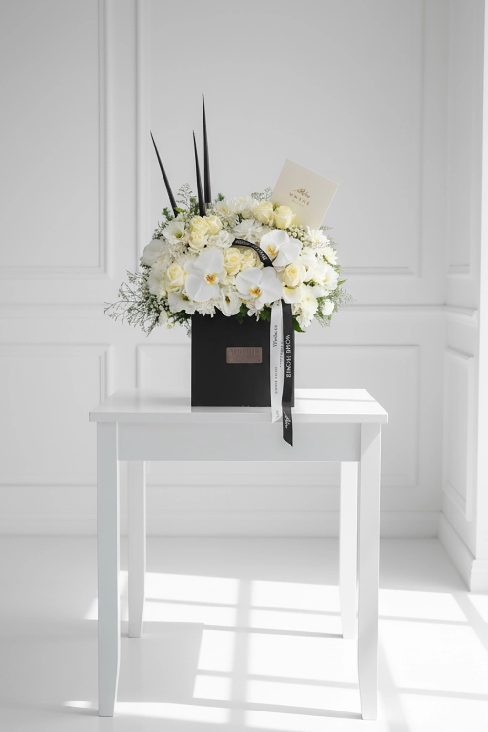 این باکس گل با طراحی ارتفاع بلند، با ترکیبی فاخر از ارکیده‌های سفید، رزهای منتخب و گل‌های فصل آراسته شده است. حضور شمع‌های مشکی در کنار گل‌آرایی سفید، هارمونی‌ای عمیق و رسمی ایجاد کرده که نمادی از سکوت، احترام و همدردی صمیمانه می‌باشد.