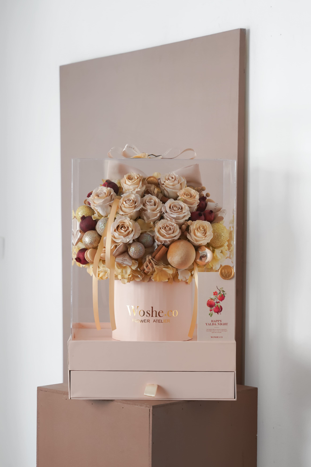 ترکیبی از رزهای جاودان متعدد در کنار شکلات‌های دست‌ساز بلژیکی، در باکسی شفاف و مینیمال که زیبایی را بی‌واسطه نشان می‌دهد؛