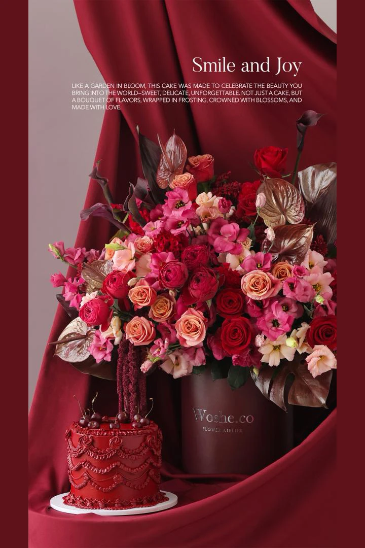 هارمونی خیره‌کننده‌ای از رزهای هلندی در طیف‌های یاقوتی عمیق، جیگری مخملی و شامپاینی لطیف، گل‌های فصل و اکسسوری آتلیه‌ای.